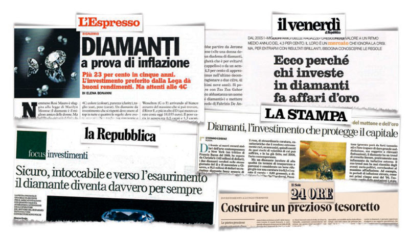 Mi riferisco a numerosissime interviste ridotte ad altoparlanti per i venditori dei diamanti, in particolare per l’Idb con Antinea De Rico e poi incessantemente Claudio Giacobazzi. Vedi, fra le testate che ho seguito: Il Sole 24 Ore, La Repubblica, La Stampa, il Giornale, Quotidiano Nazionale, l’Espresso, Milano Finanza, il Mondo, Economy.