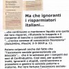 Seguendo un canovaccio sperimentato, i risparmiatori che non obbediscono a comando sono bollati di ignoranza finanziaria. Il minimo che gli venga detto è che perdono buone occasioni di guadagno, lasciando infruttiferi i propri risparmi. Al che però vengono in mente i diamanti rifilati a prezzi taroccati, le gestioni patrimoniali prive di ogni trasparenza e quella trappola micidiale che è la previdenza integrativa. E uno capisce perché si rifiutino, malgrado le pressioni, di comprare checchessia.