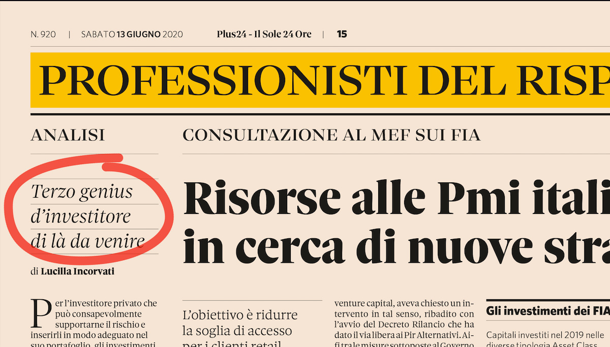 Per passare a cose facete, l'ennesimo strafalcione del Sole 24 Ore (Plus24, 13-6-2020 pag. 15). La giornalista riporta quanto dettole dall’Associazione del Private Banking, ma fraintende; e senza porsi domande parla di un fantomatico "terzo genius", non avendo capito che si trattava invece di un “tertium genus” (terzo genere), inteso come investitore fra il privato e il professionale: Sole24Ore-2020-06-13-
